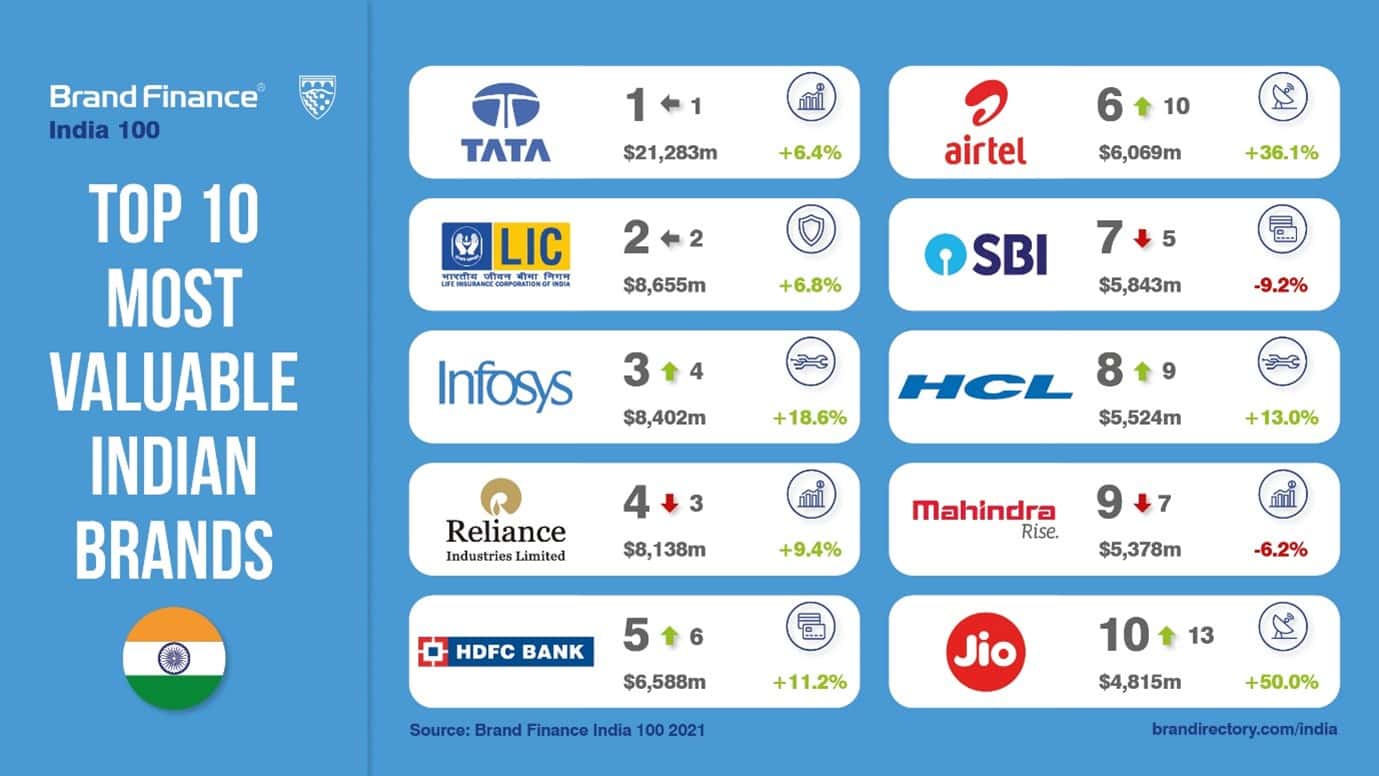 IT Services have become the third most valuable sector in India and Infosys bags the third position in the list as the highest-ranked standalone IT services brand. Other IT Services brands which have made it to the top ten list include HCL in 8th position and Tech Mahindra which is incorporated in the Mahindra Group’s conglomerate brand value in the 9th position. In the telecom industry, Airtel bags the 6th position as the most valued brand and Jio comes in at the 10th position.