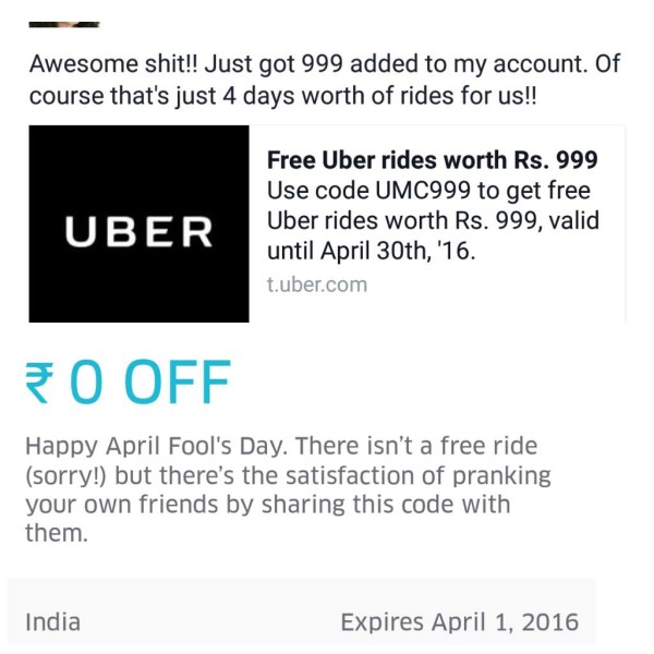 Ola and Uber both are active competitors both on the street and on their social media platform. The masterstroke of Uber combining Promotion and humour into one was bang on. Like the popular rewards of Uber, the app popped up with a similar notification with a promo code. But well, when the amount is as high as Rs 999, it would not be that easy! And yes, It was a Happy April Fool’s for the Uber Users!