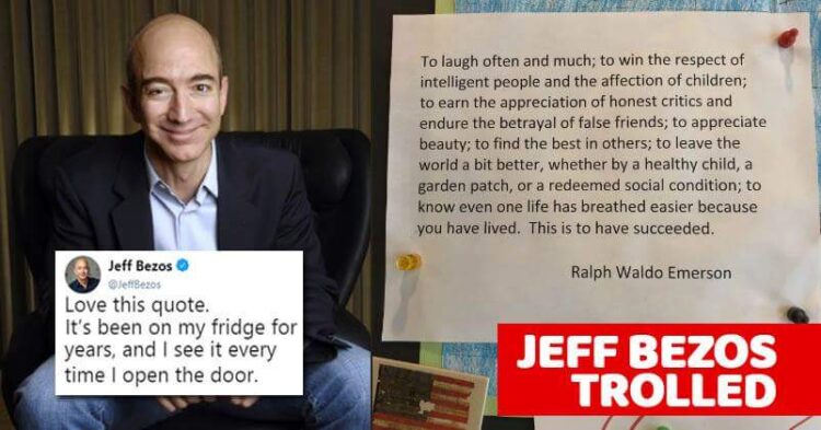 Amazon founder and CEO, Jeff Bezos, got trolled on Twitter for misattributing a quote. He also shared that he always reads this quote while opening his fridge. The quote reads “To laugh often and much; To win the respect of intelligent people and the affection of children; To earn the appreciation of honest critics and endure the betrayal of false friends; To appreciate beauty, to find the best in others; To leave the world a bit better, whether by a healthy child, a garden patch, or a redeemed social condition; To know even one life has breathed easier because you have lived. This is to have succeeded.”