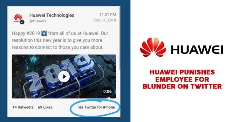 Chinese technology brand Huawei has punished 2 employees for New Year greetings posted on its official Twitter account using an iPhone.