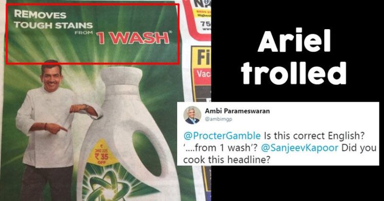 A recent print ad from P&G’s detergent brand Ariel had a grammatical mistake. The ad was published in The Mumbai Mirror on June 2 first and June 11. The whole incident got popular on Twitter after a cheeky post was shared by brand strategist and former adman MG Parameswaran (Ambi).