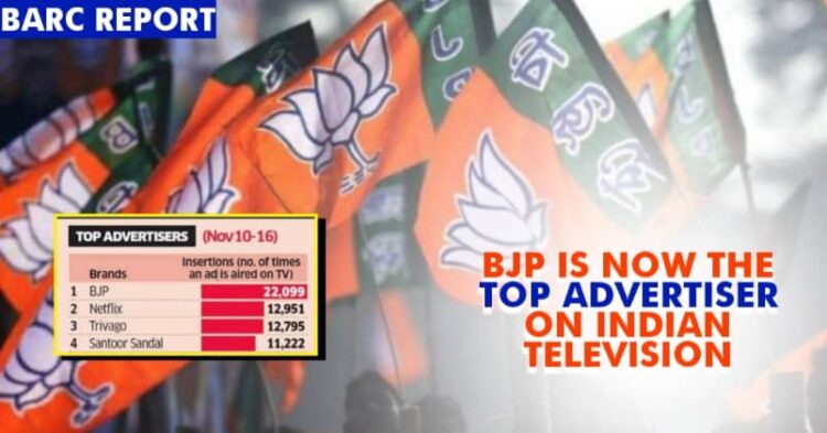 According to the latest report released by Broadcast Audience Research Council (BARC), Indian political party Bharatiya Janata Party(BJP) is the top brand to advertise on television right now.