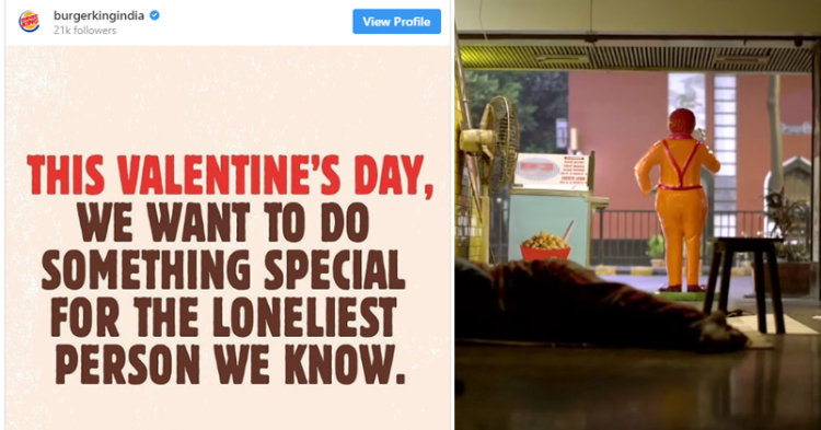 As a part of its #LonelyNoMore campaign, Burger King India has launched a video ad that showcases a character similar to Ronald McDonald. The story in the video revolves around the character who is sad and is looking for a company because he has always been alone. Anyone watching the ad can feel his sadness easily. After showing the loneliness, the video encourages its fans to give the “Loneliest Man” a company and upload a selfie with him and tag Burger King India on social media. In return, the restaurant chain will give its customers a free Whopper on Valentine’s Day.