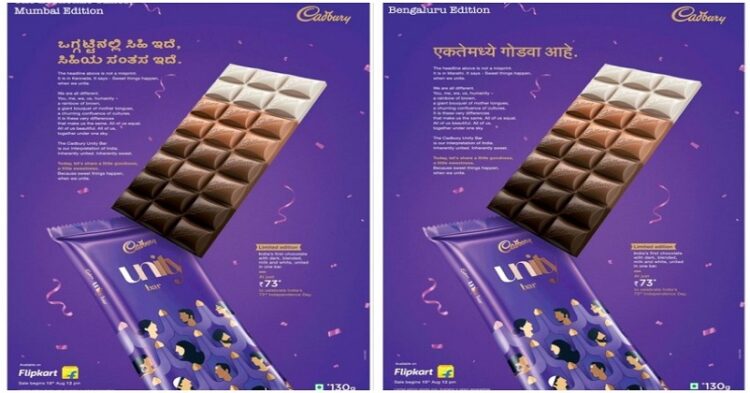 This Thursday, a print ad for the company has sent across a subtle yet strong message across the nation. The full-front-page ad that was published in the Economic Times contained an image of Cadbury‘s new ‘Unity Bar’. What stood out was that the captions that were used were neither in English nor in the local language of the city.