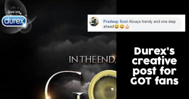 Latching on GOT’s popularity and curiosity of digital audience for its 2019 premiere, Durex has posted an image reading “In the end, we’ve GOT you covered”. This along with caption The show’s end won’t be the only thing coming. To buy Durex Extra Time and a link.