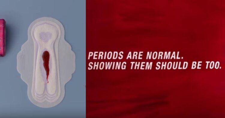 The ad shows a man buying sanitary towels for a woman in his life, and a woman is also shown who is relaxing in a pool. The video ends with the tagline: “Periods are normal. Showing them should be too.”