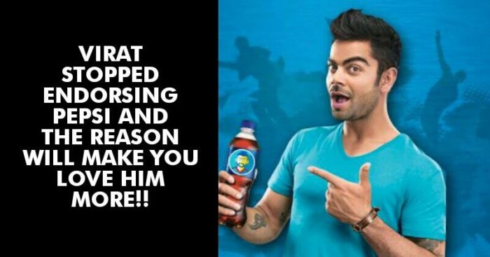 Virat was endorsing popular cold drink brand Pepsi from past 6 years but now he has decided not to do it anymore as the contract with Pepsi has been completed and now he feels he should not do it as he doesnt consume cold drinks anymore.
