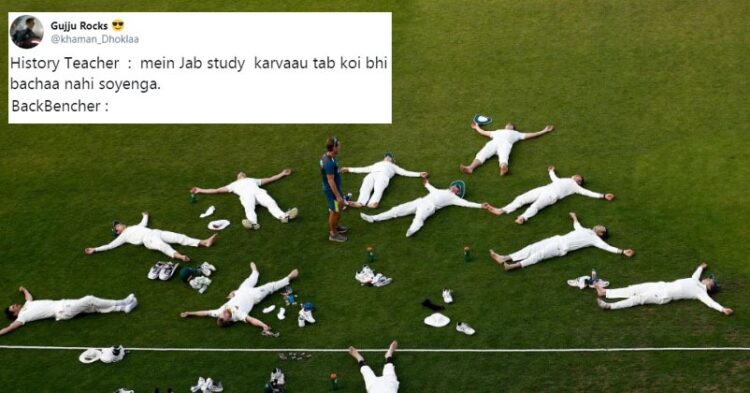 ICC has the habit of asking for caption on its Twiter and its a great way to communicate with cricket fans as they get to express their words. In a recent tweet ICC posted an image showing all the players lying on the ground resting and only one guy standing.