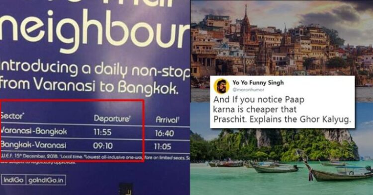 IndiGo announced a new route between Varanasi and Bangkok and people couldn’t help but find humor in it. To give you an idea why this happened, Varanasi is a place among the most visited pilgrimage spots in India and, on the other hand is Bangkok, is popular all across the world for adult fun.