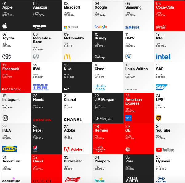 - Apple becomes the first brand to cross the $300 billion mark and stood at the #1 position this year.