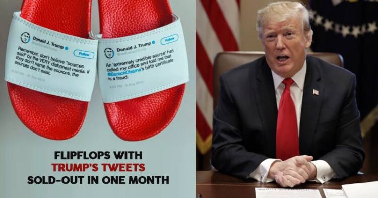 Produced by Sam Morrison, a 27 year old photographer and artist based in Los Angeles, these are pairs of flip flops with contradictory tweets by Donald Trump, the United States President. According to Sam, Trump’s 40,000 tweets are enough to find a lot of contradictory statements made by the President. His aim is to highlight Donald Trump’s hypocrisy.
