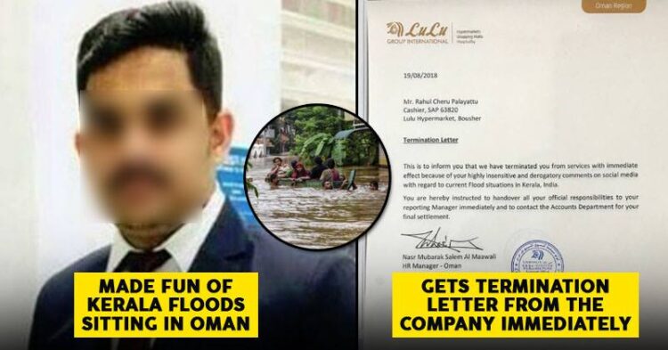 “This is to inform you that we have terminated you from services with immediate effect because of your highly insensitive and derogatory comments on social media with regard to current Flood situations in Kerala, India.