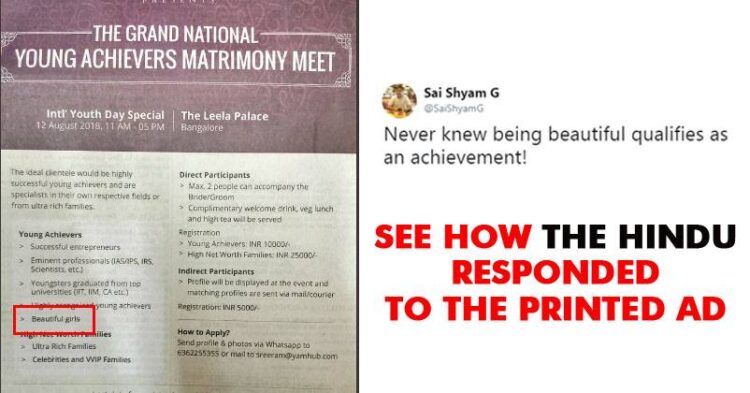 Glad to see @the_hindu taking corrective action after yesterday's matrimony ad getting severe backlash from the readers. pic.twitter.com/srNs9zkREo