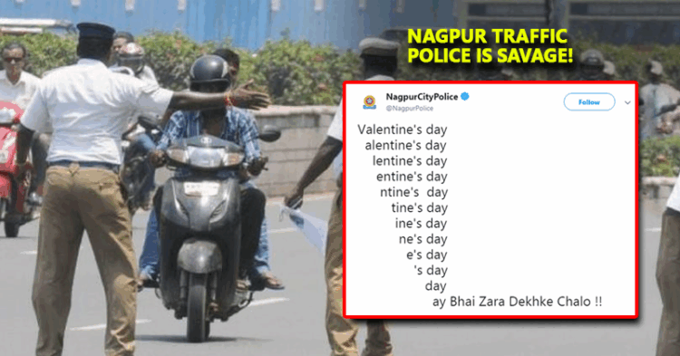 Taking the benefit of the trend, Nagpur Police has gone creative to promote road safety in India. The tweet began with ‘Valentine’s Day’ and ended with ‘ay Bhai Zara Dekhke Chalo!!’