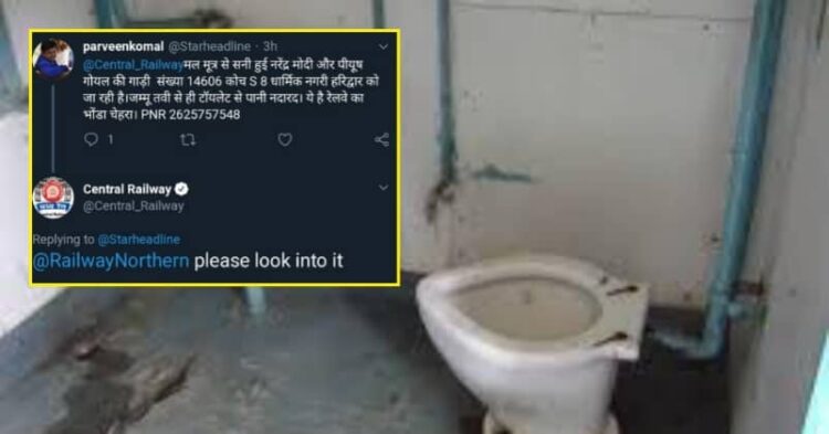What happened is passenger complaint about the dirty conditions in a train toilet and his complaint was quickly by the authorities on Twitter. Parveen Komal the passenger, tweeted, “मल मूत्र से सनी हुई नरेंद्र मोदी और पीयूष गोयल की गाड़ी संख्या 14606 कोच S 8 धार्मिक नगरी हरिद्वार को जा रही है।जम्मू तवी से ही टॉयलेट से पानी नदारद। ये है रेलवे का भोंडा चेहरा। PNR 2625757548.” tagging Central Railway in the caption.