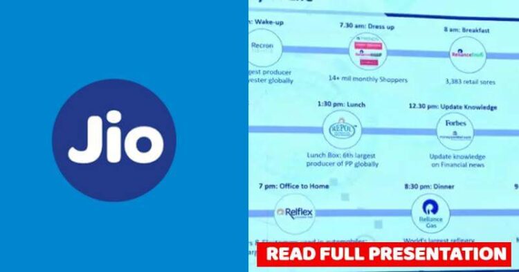 In a slide displayed at a presentation recently, Reliance showcased different industries it operates in. The company tells its importance in every Indian’s life in a very interesting way. Reliance illustrated how the average Indian interacts with Reliance’s products from starting of the day to going to bed.