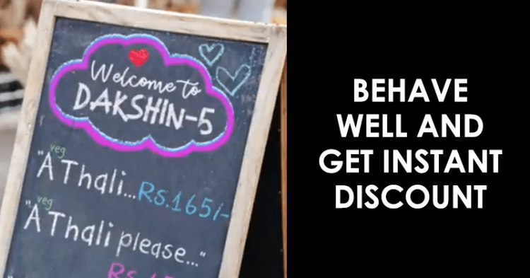 In a bid to encourage good manners among people, a restaurant called Dakshin-5 in Telangana is offering courtesy discounts, by which one can earn discounts of upto INR 35/-. The more courtesy you show, the more discounts you earn.