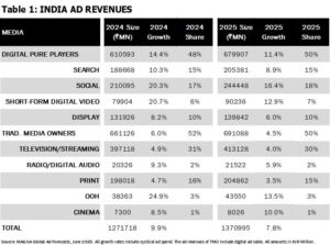 The YOY growth of +7.8% in 2025 with total revenue increasing by Rs 99 billion taking the total adex from Rs 1,272 billion ($14.7 billion) to Rs 1,371 billion ($15.9 billion). Digital Pure Player formats valued at Rs 680 billion ($7.9 billion) are driving the advertising economy, which is estimated to grow at +11.4%.