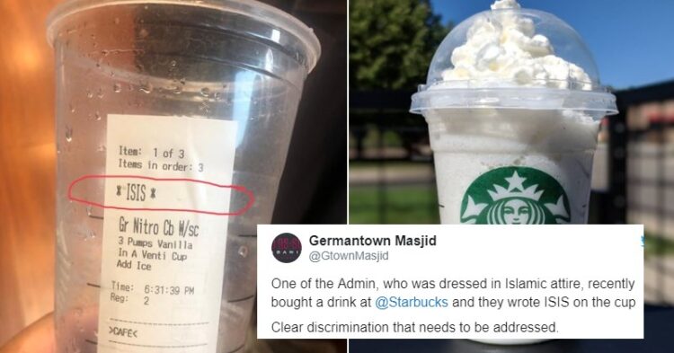 One of the Admin, who was dressed in Islamic attire, recently bought a drink at @Starbucks and they wrote ISIS on the cup