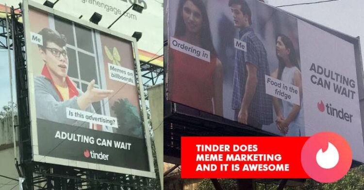 Both the digital media and Outdoor memes have helped the brand to create a buzz among audience. Often brands tend to miss out the opportunity of using meme marketing in outdoor but Tinder has avoided ignoring this and is achieving great value from it. Have a look at the creatives we are talking about:
