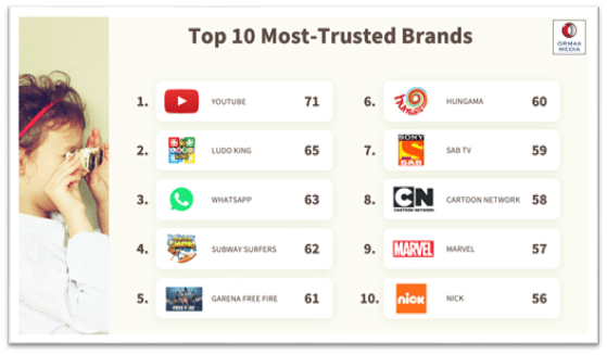 As per the results, YouTube has emerged as the No. 1 most-trusted brand among Indian kids, with a Brand Trust Score of 71%. Ludo King (65%) followed the lead and WhatsApp (63%) stood at the third spot. The report further states that the top 5 ranks are all taken by digital brands, signifying the strong engagement digital media has built with kids in urban India.