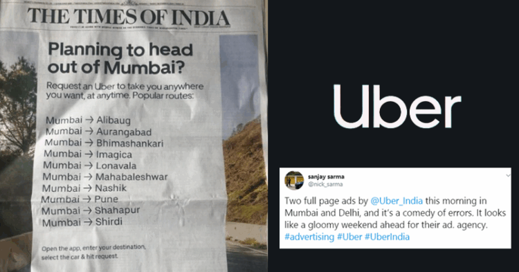 Two full page ads by @Uber_India this morning in Mumbai and Delhi, and it’s a comedy of errors. It looks like a gloomy weekend ahead for their ad. agency. #advertising #Uber #UberIndia https://t.co/05EgduDeAu