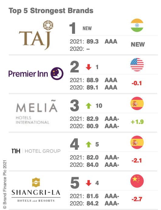 This British hotel chain is the United Kingdom’s largest hotel chain with over 800 hotels. It held the first position in 2020 and currently holds a Brand Strength Index of 88.9 out of 100, with a corresponding AAA rating.