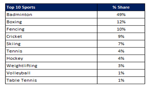 Badminton sports account for half of the total ad volume in the Top 10 sports linked with female sports celebrities. One of the most popular sports overall, cricket, came in fourth place in terms of ad volume share.